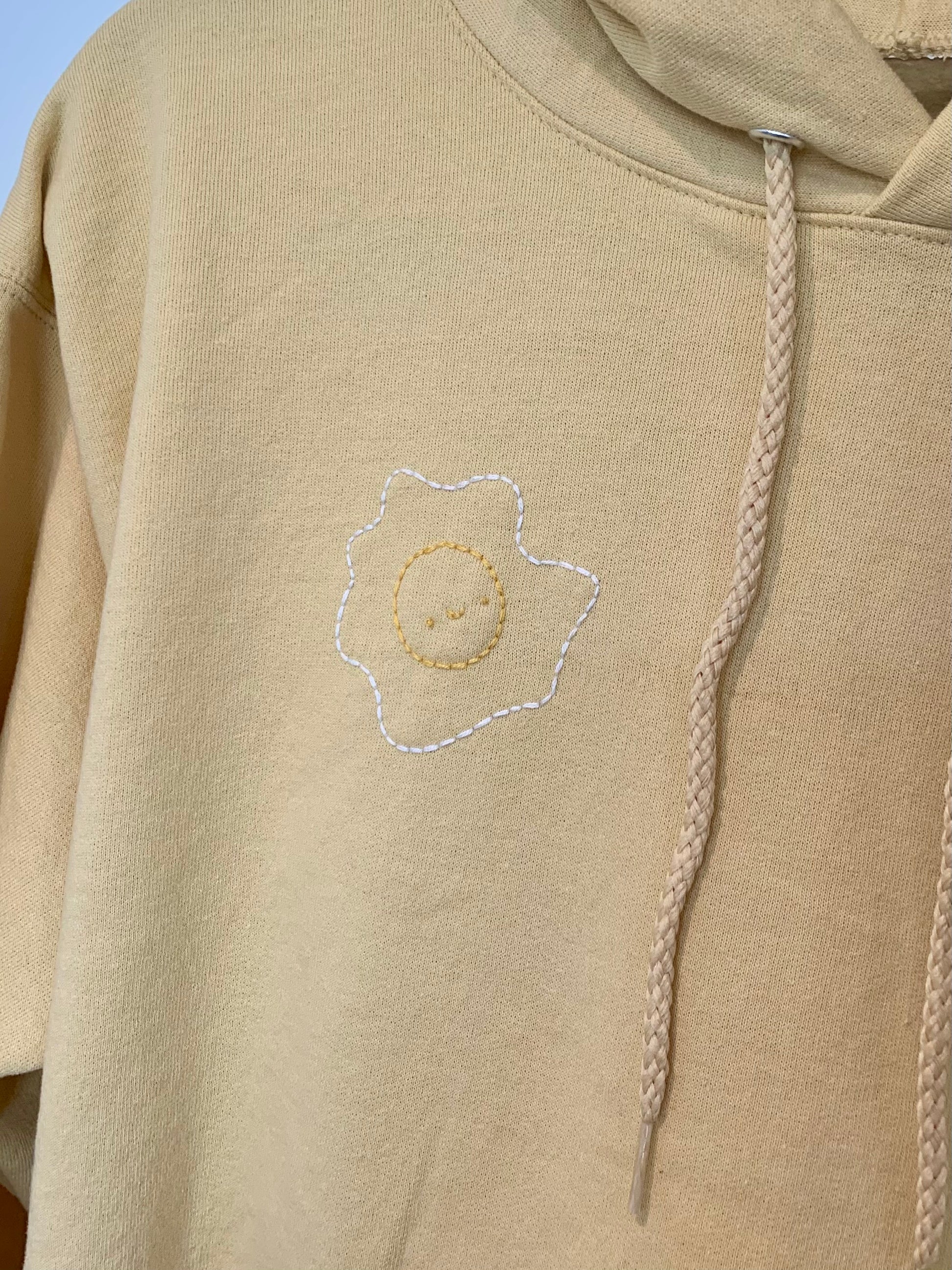 Add a touch of whimsy to your everyday look with this hand-embroidered fried egg hoodie. Featuring a cheerful, smiling fried egg design, this hoodie combines comfort, style, and personality into one perfect garment. Whether you're lounging at home or heading out with friends, this cozy sweatshirt is sure to make you stand out with its unique and playful flair.