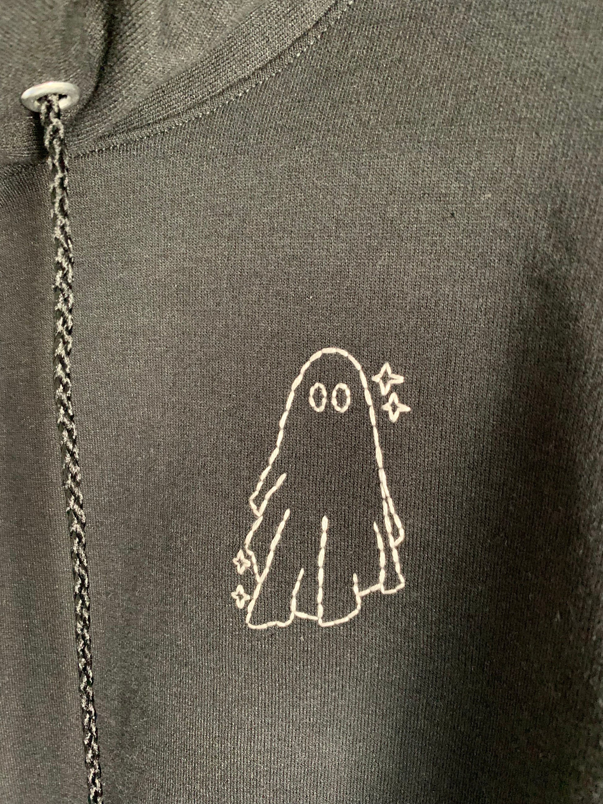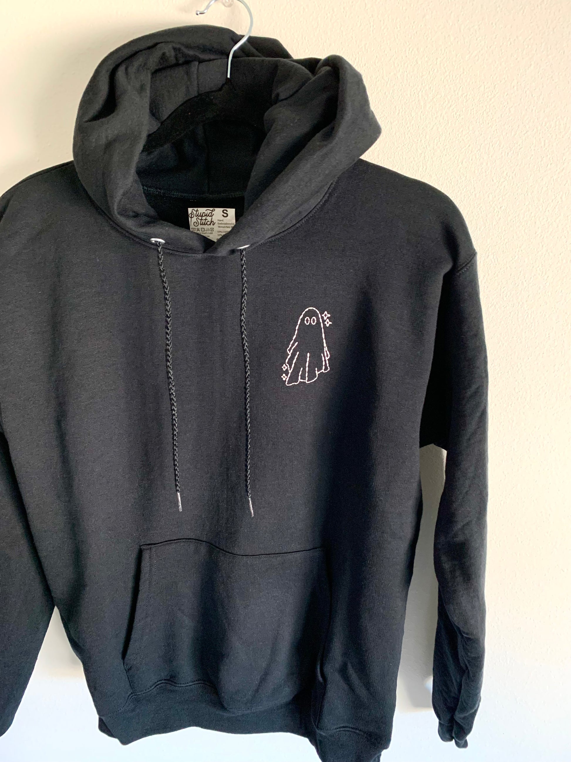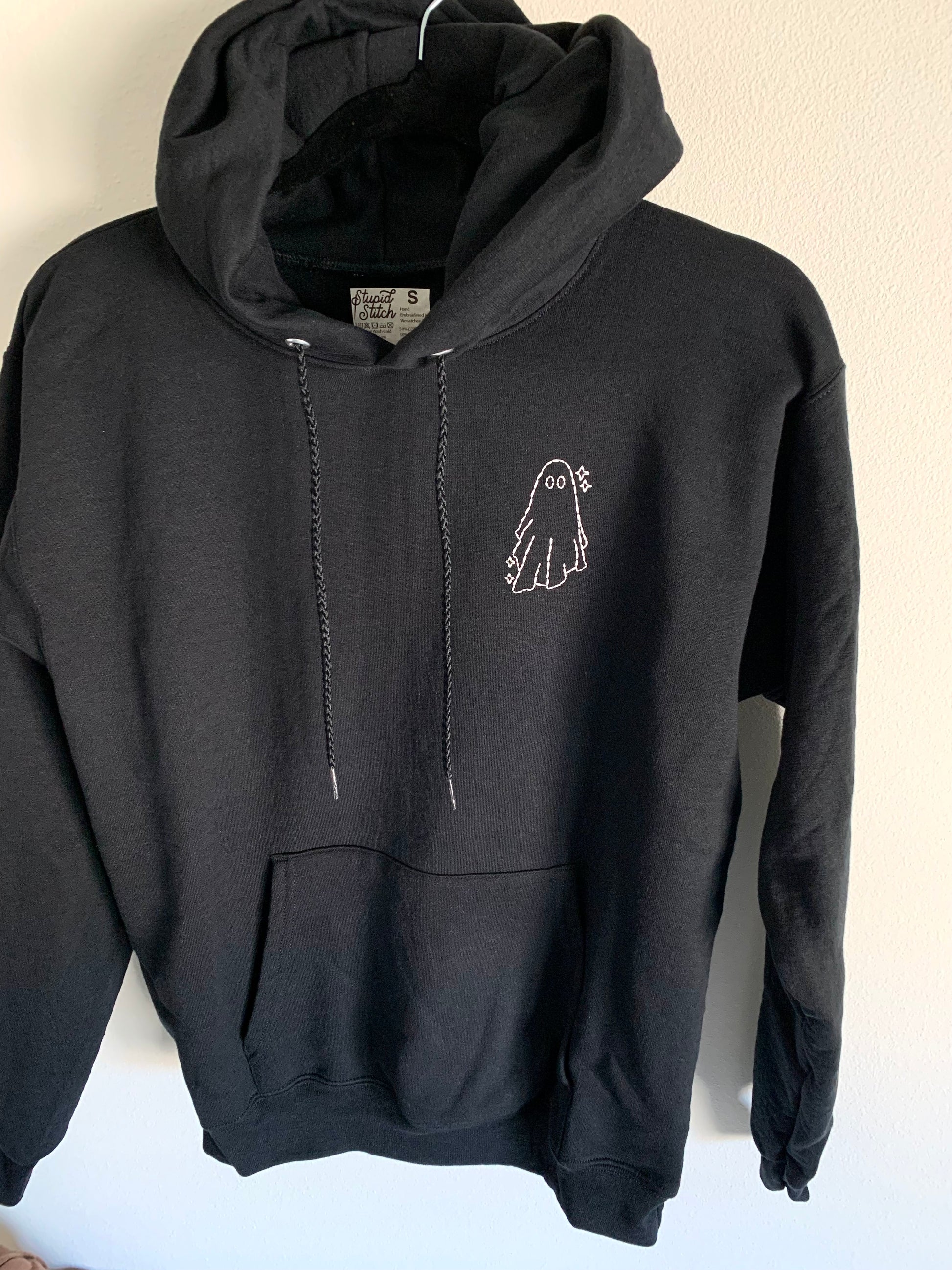 Hand Embroidered Sparkly Sheet Ghost on Solid Black Hoodie