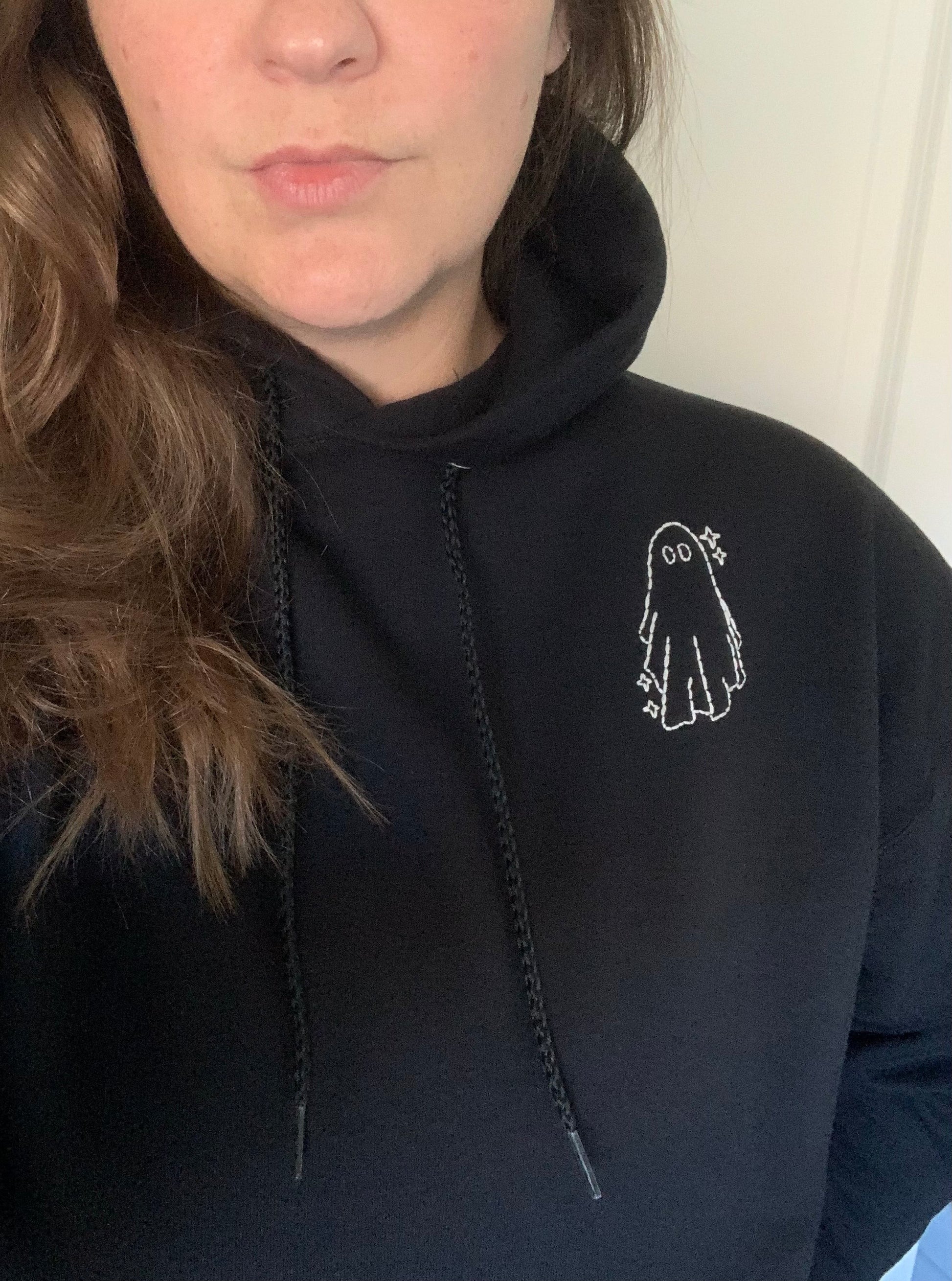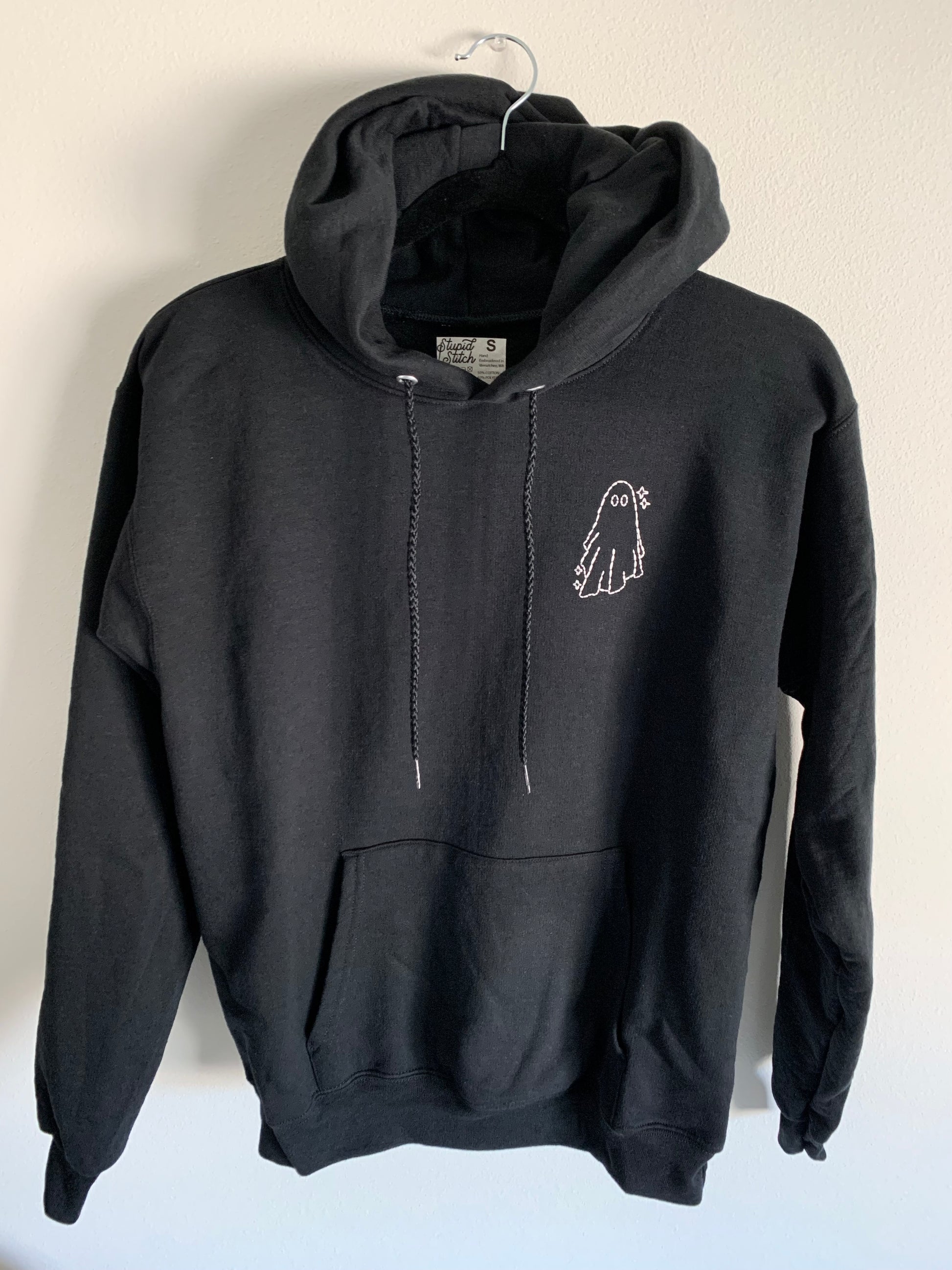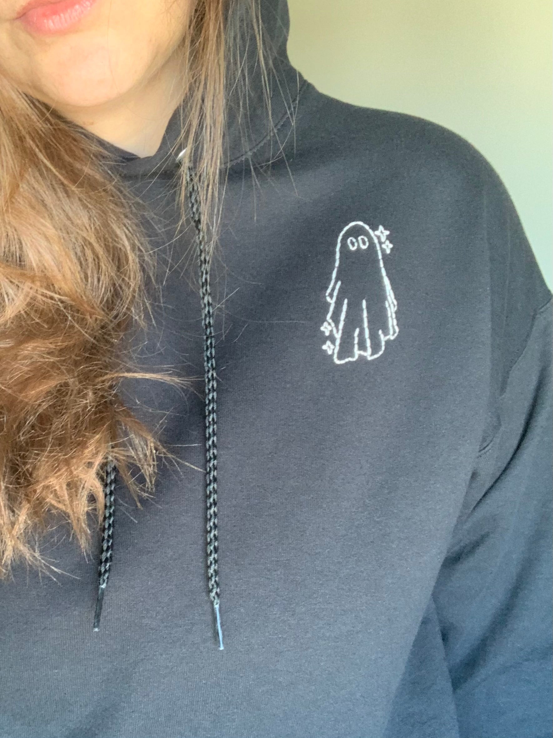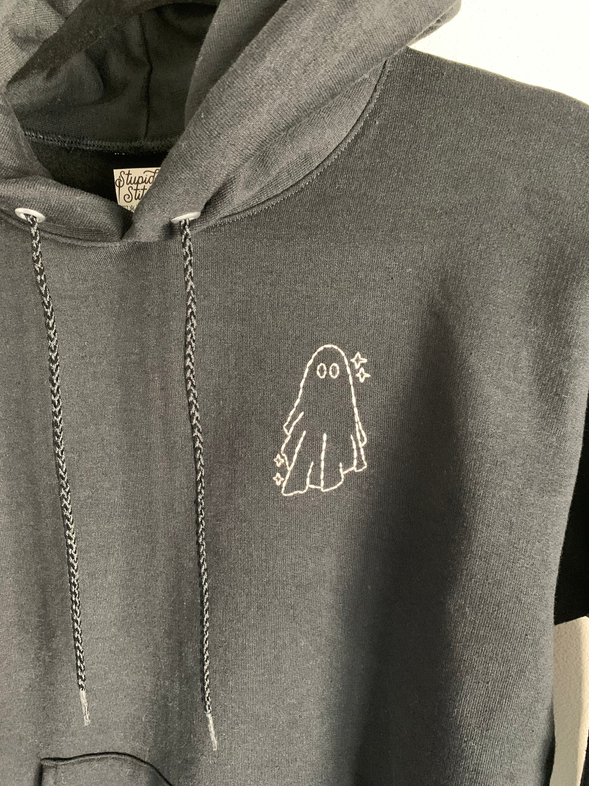 Hand Embroidered Sparkly Sheet Ghost on Solid Black Hoodie
