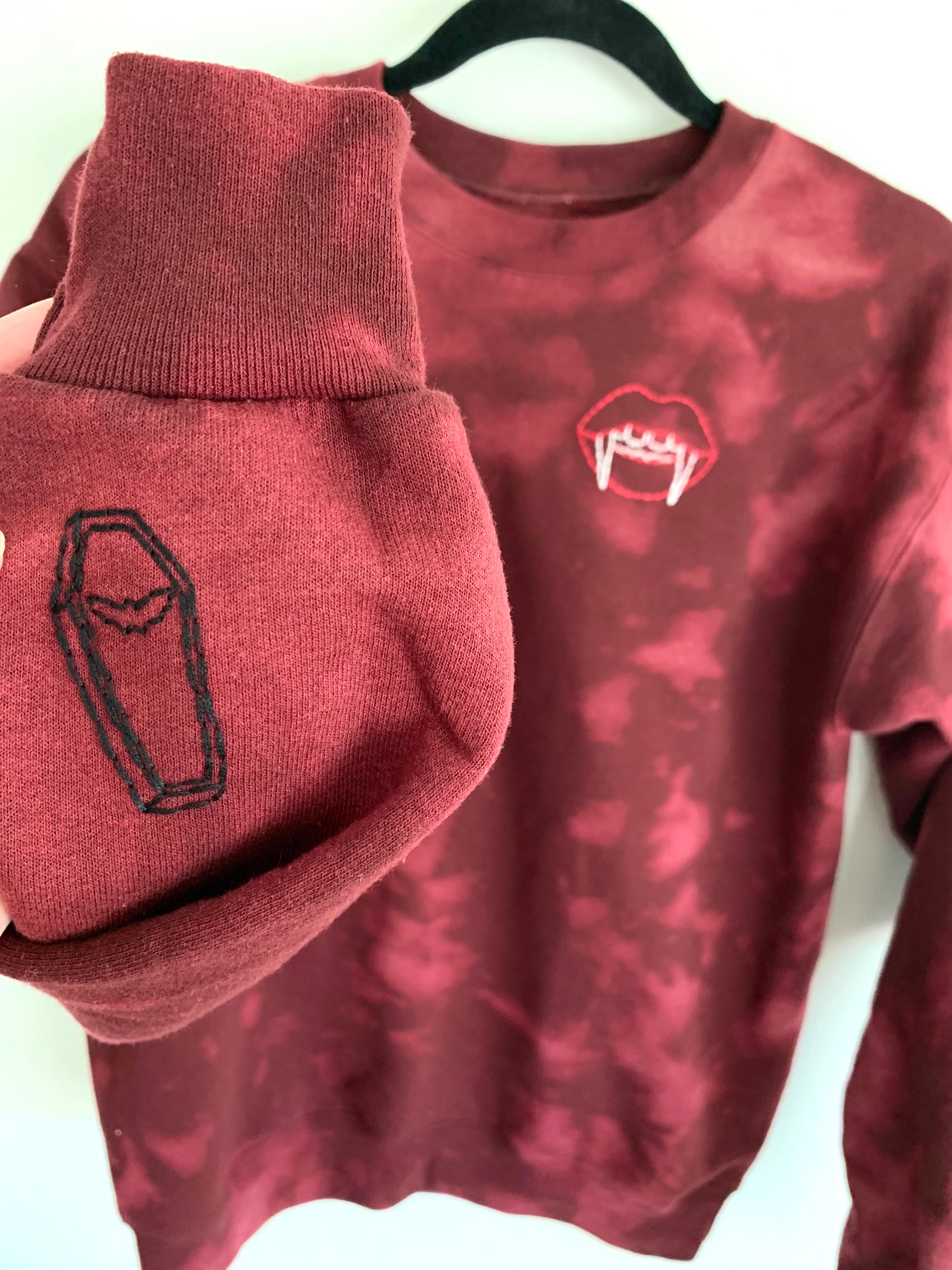Bleach Tie Dye Vampire Lips Sweatshirt – Hand Embroidered Bat Coffin – Unisex Maroon Goth Pullover