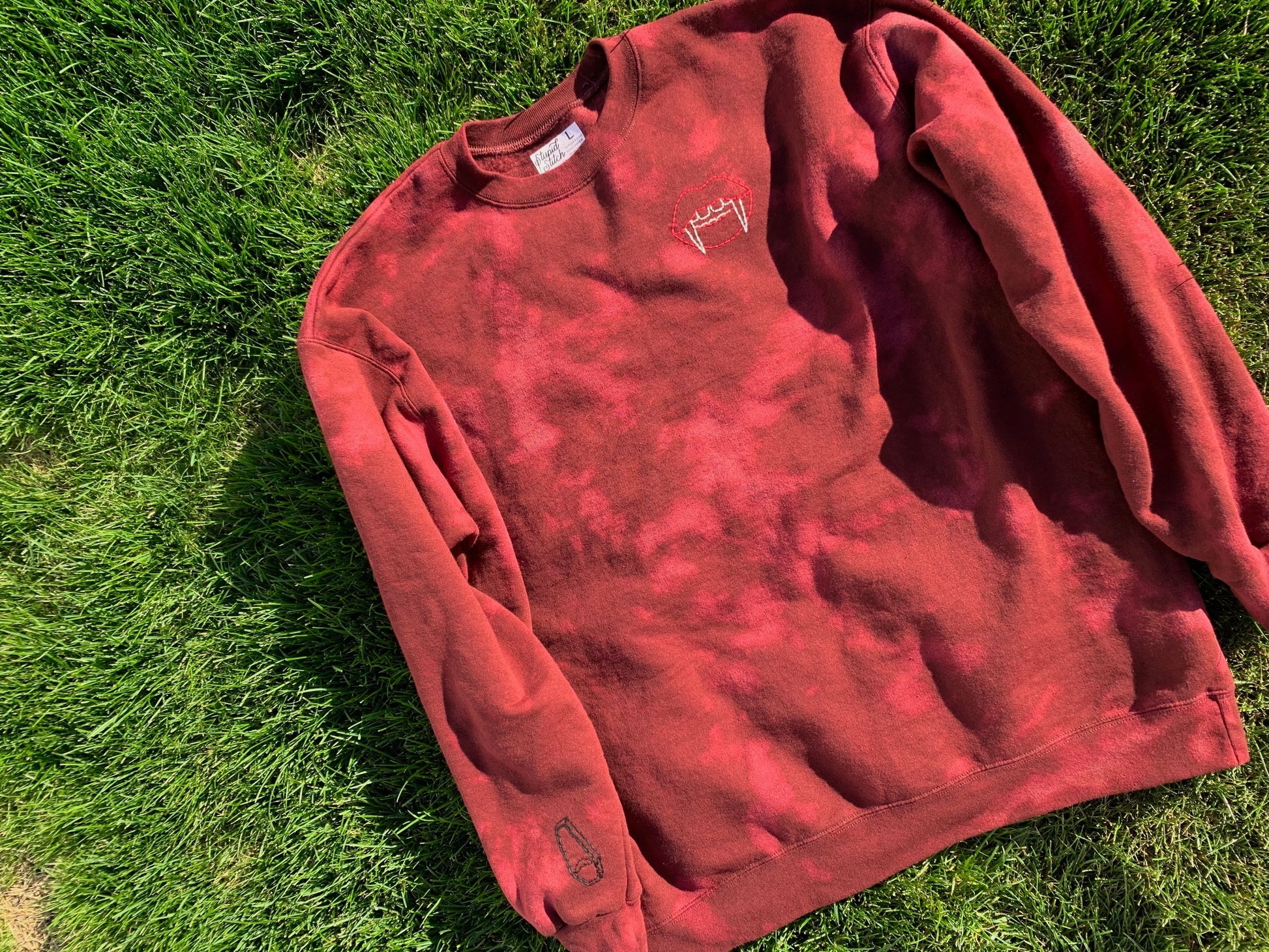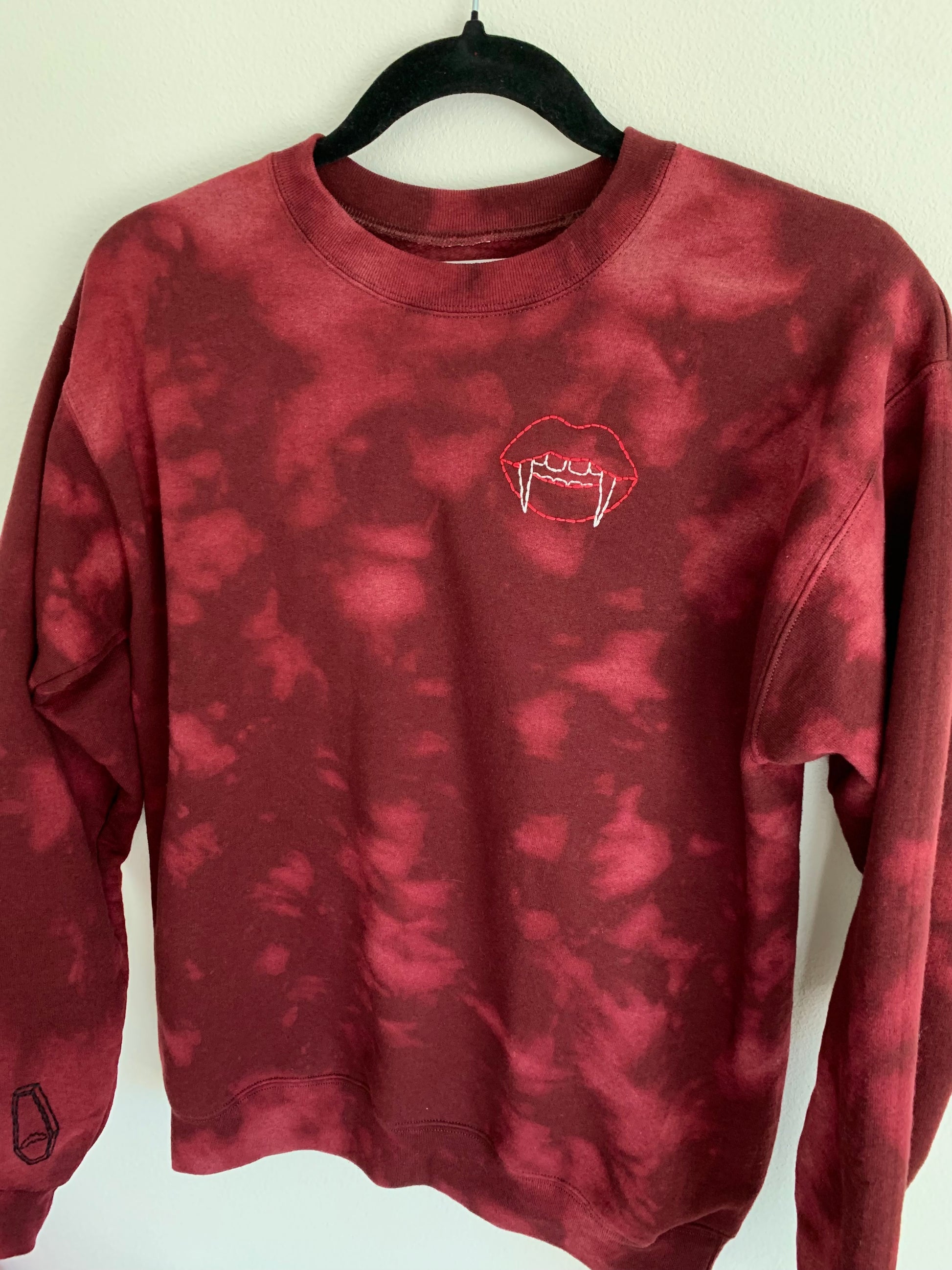 This maroon Hanes EcoSmart crewneck has been bleach tie-dyed for a hauntingly unique effect—no two are exactly alike! Hand-stitched vampire lips at the chest and a bat coffin on the sleeve add a dark, playful twist to this comfy classic.