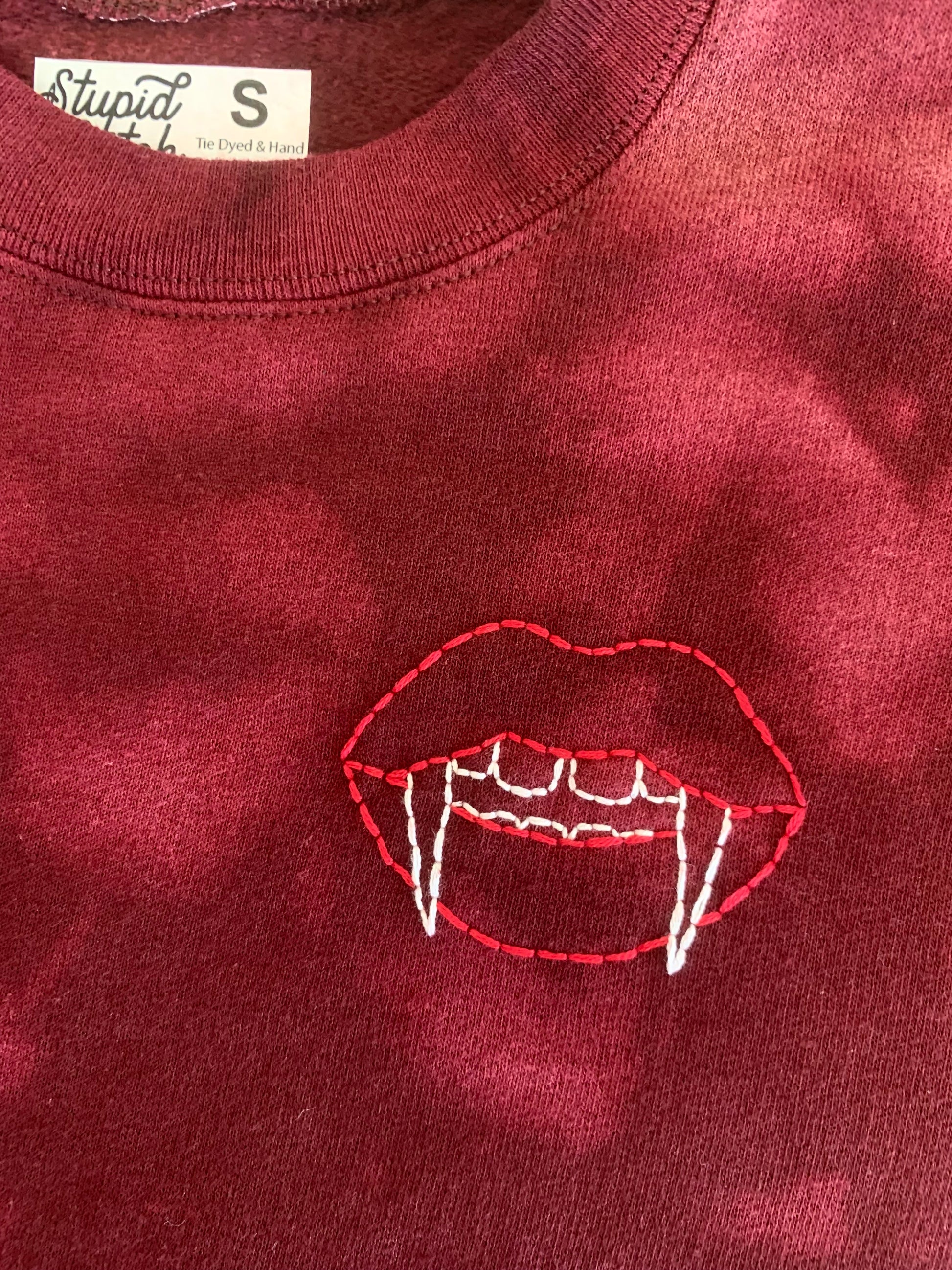 Made to Order Vampire Lips With Bat Coffin Hand Embroidery, Spooky Season, Dark Horror, Long Sleeve Unisex Maroon Tie Dyed Fleece Sweatshirt