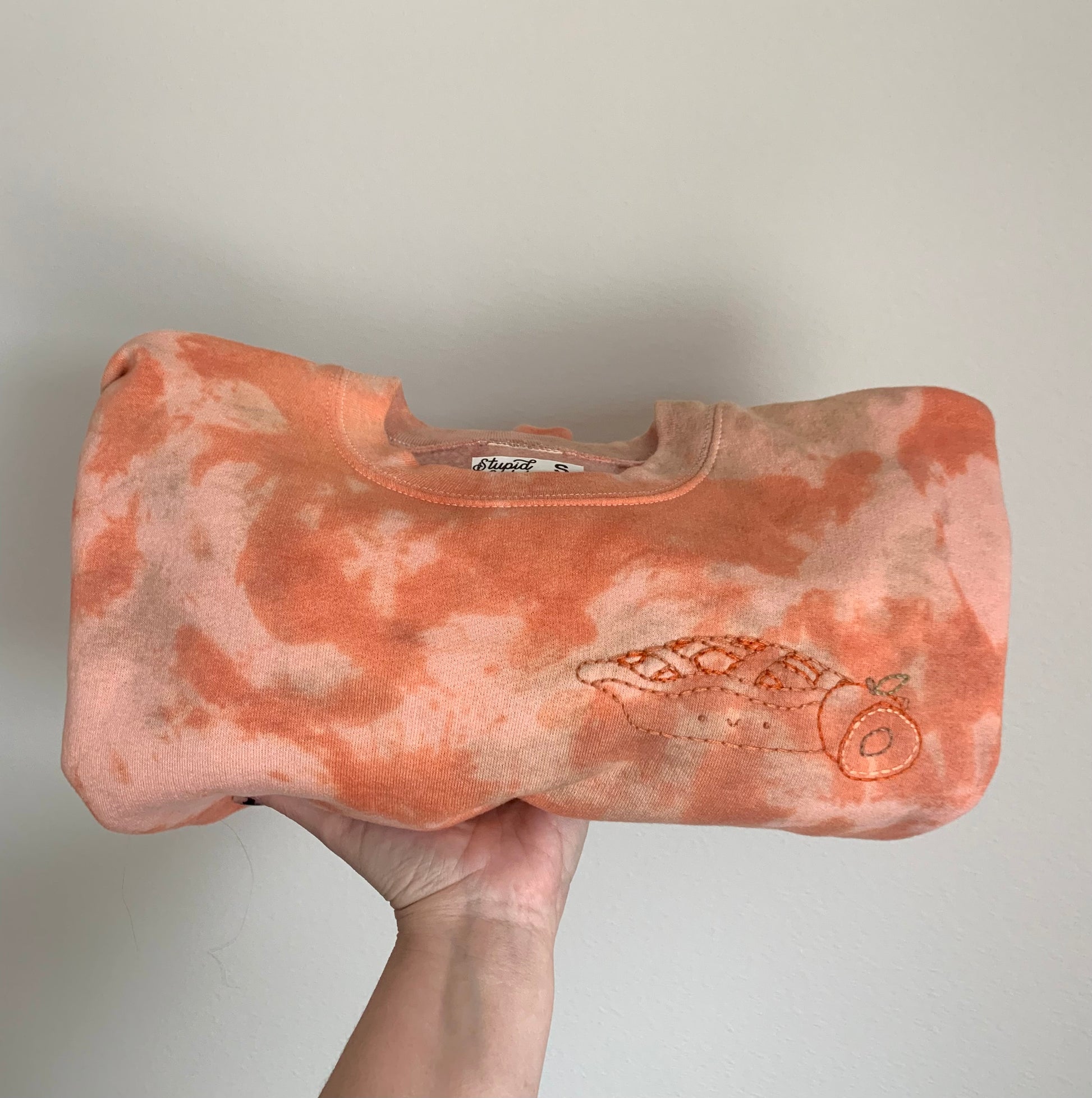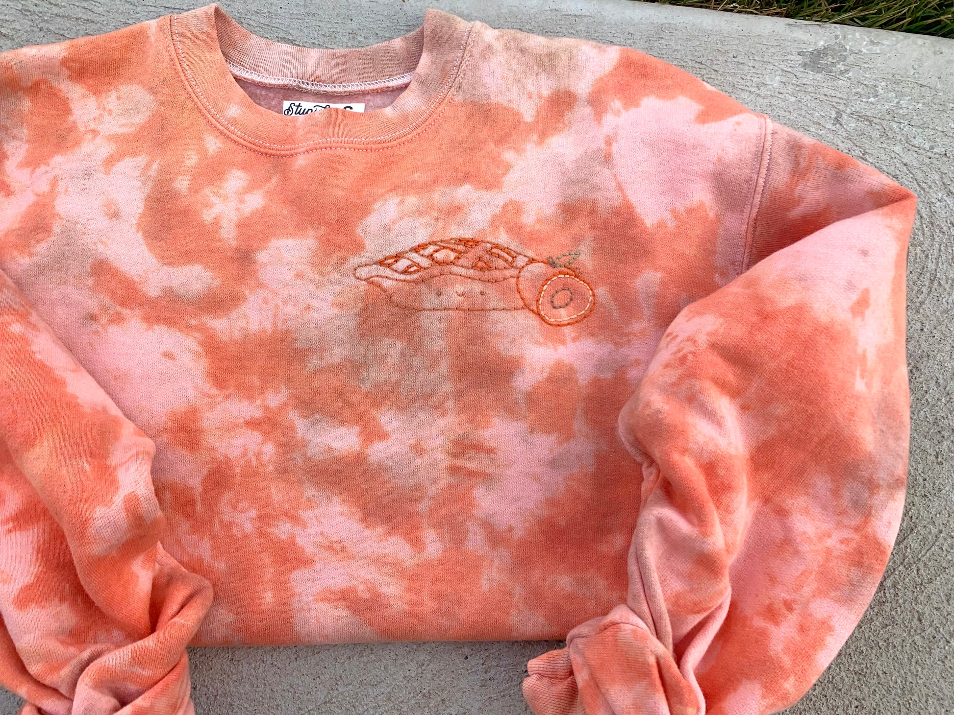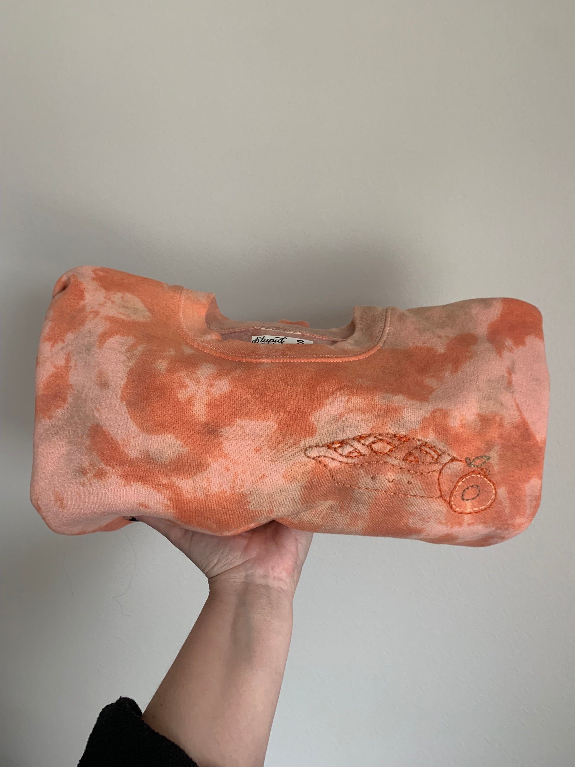 - Tie-Dye: Originally a white sweatshirt, each one is individually hand tie-dyed, creating a pastel orange swirl pattern. Tie-dye variations may occur between sizes, making each sweatshirt a unique piece.